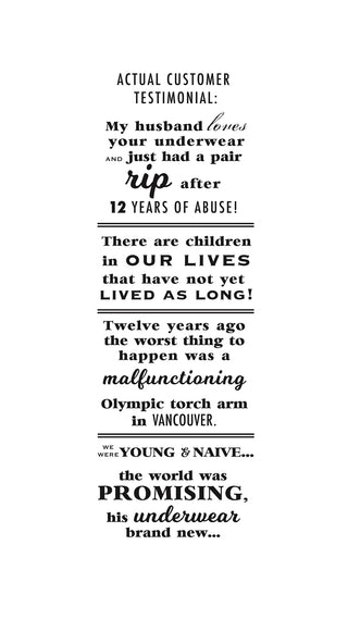 “I've been wearing your undies for 20 years (some are still the original pairs, they're such great quality). They're hands down the most comfy and long lasting undies I’ve ever had. Love them! Seriously great work.”– Happy customer