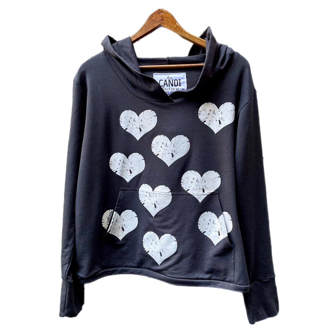 it has big cuffs...it has screen printed hearts...it's an all over awesome hoodie.