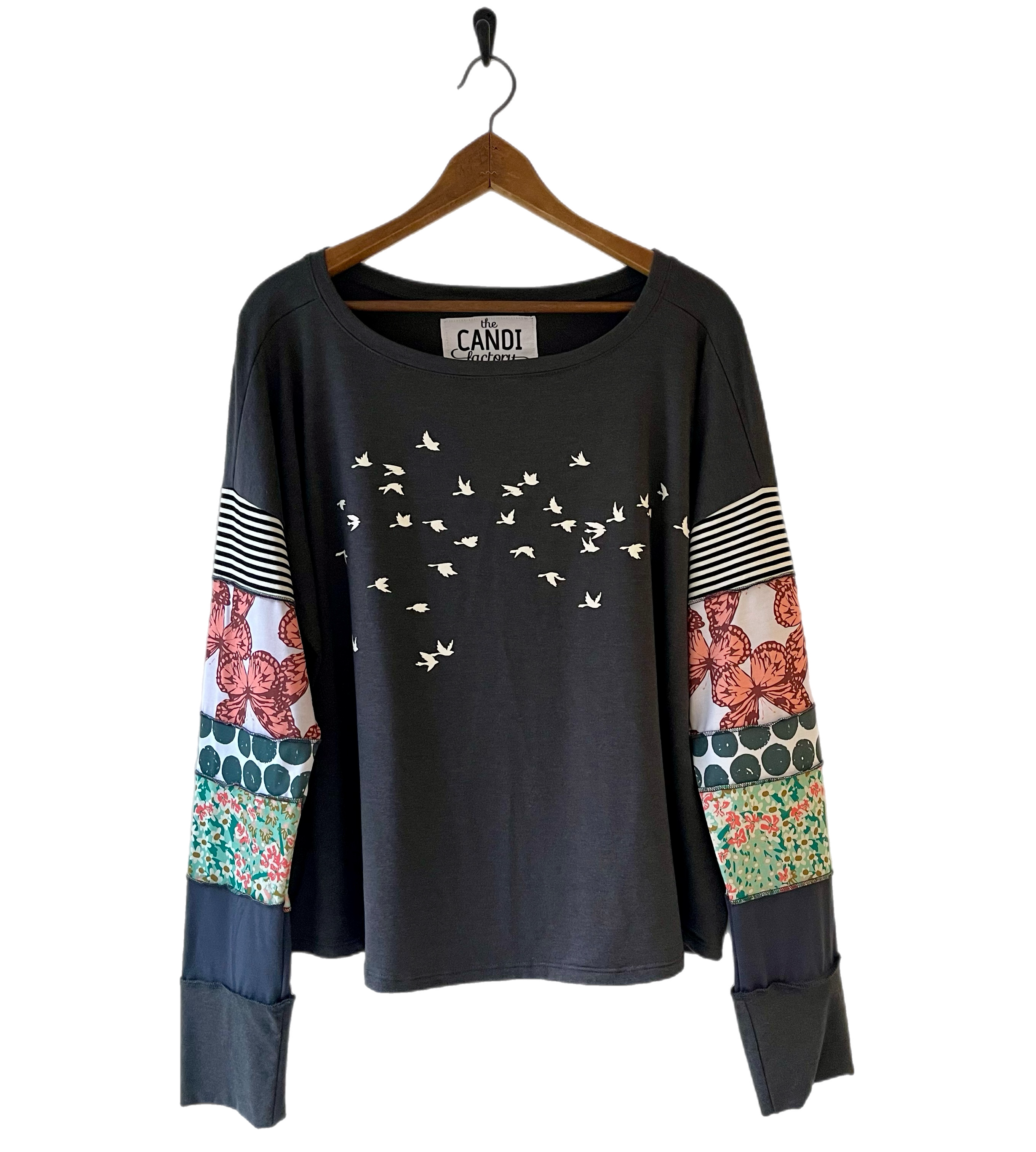Each shirt is One of a Kind. Screenprinted with the cutest little birds.95% bamboo / 5% spandex. Cool wash in the machine, air dry.