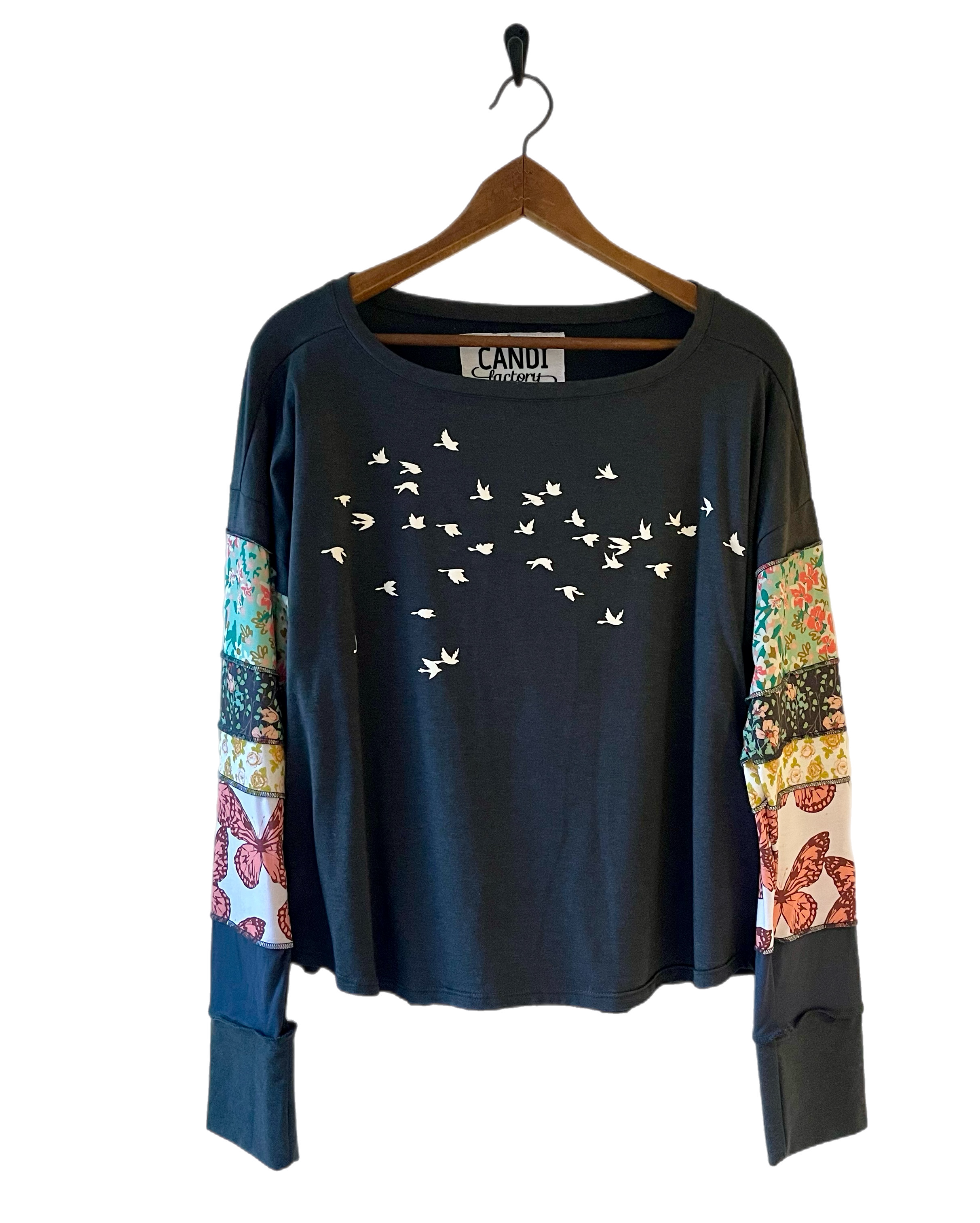 Each shirt is One of a Kind. Screenprinted with the cutest little birds.95% bamboo / 5% spandex. Cool wash in the machine, air dry.