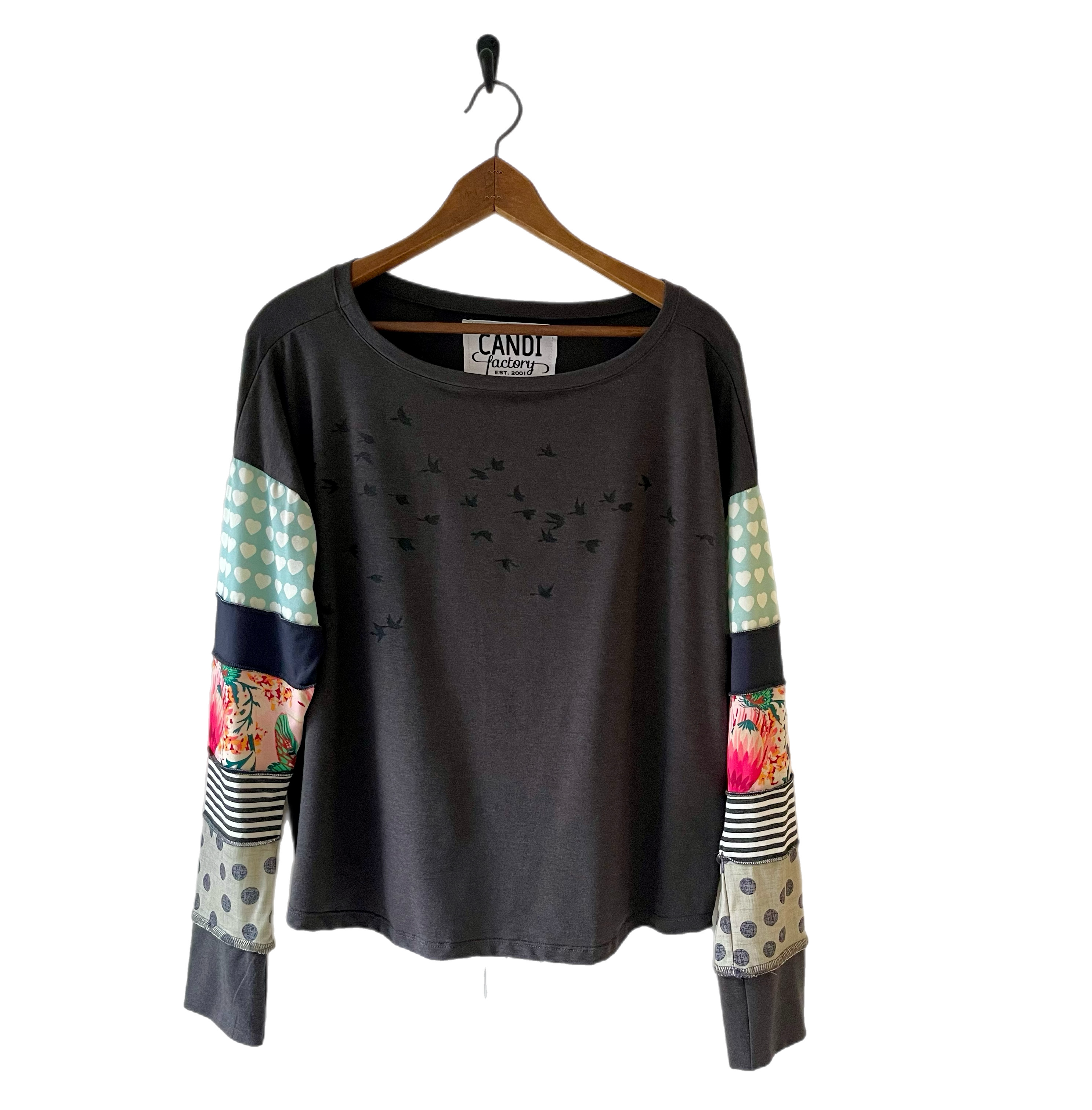 Each shirt is One of a Kind. Screenprinted with the cutest little birds.95% bamboo / 5% spandex. Cool wash in the machine, air dry.